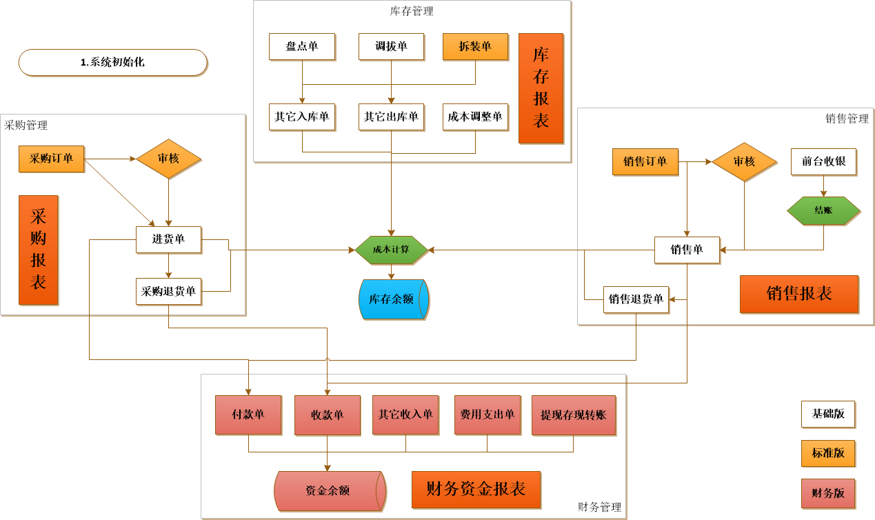 4) 销售业务流程 :客户订货、签订销售合同 时录入“销售订单”,销售发货出库时 录入“销售单”,系统减少库存余额、生成客户应收账款,销售现结业务直接生成收款单、赊销业务在回款后录入“收款单”,自动核销应收账款、自动增加资金余额。